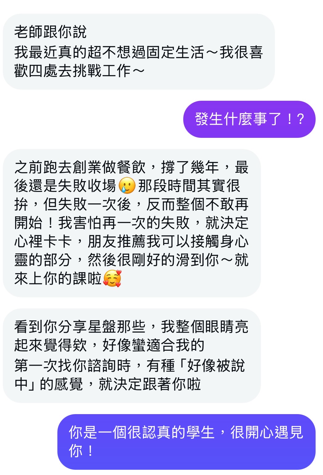課程有「學員專屬群組」兩位導師在群組內定時輔導,確保學員理解星盤識人技巧